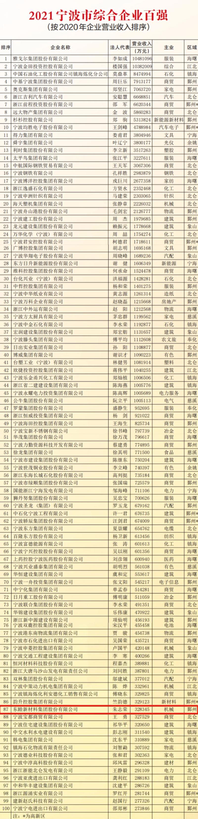 2021年8月31日,宁波市企业联合会、宁波市企业家协会、宁波市工业经济联合会联合发布了2021宁波市综合企业百强榜,以及制造业、服务业、竞争力百强榜。东睦股份首次荣登宁波市综合企业百强榜(排名第87位),并再次荣登宁波市制造业企业百强(排名第48位)以及竞争力企业百强榜(排名第23位)。
