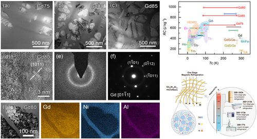 最近,该团队利用熔体抽拉技术开发了一系列Gd基非晶纳米晶复合磁制冷材料。这种非晶复合磁制冷材料兼具了Gd基非晶合金和纳米晶的优点,通过优化合金成分、调控制备工艺,实现了对其纳米晶化相大小、数量和分布的调控,进而获得了优异的磁热性能。该复合材料在从70 K到近室温都具有较大的磁熵变值,其磁制冷能力可以达到985 J/kg,明显优于现有的其它晶态和非晶磁制冷材料。