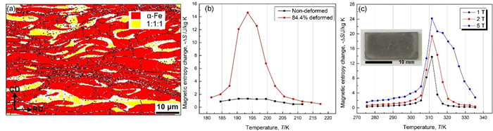 最近,中国科学院宁波材料技术与工程研究所磁性相变材料团队系统开展了变形量31.3%~84.4%的923 K热锻压LaFe13.92Si1.4合金的研究,发现变形样品中磁热相的形成速率显著高于未变形样品,且形成速率随着变形量的增加不断提高。利用背散射电子衍射技术表征变形样品微观组织,观察到热锻压样品中α-Fe和富La相呈层状分布,同时变形过程中出现的连续动态再结晶(Continuous dynamic recrystallization)在其内部形成高密度晶界(图1a)。这种垂直和水平晶界构造的奇异层状组织增加了磁热相的形核位点,且高密度晶界有利于促进元素扩散。84.4%热锻压样品经1323 K热处理1 h即可获得高达82.2 vol.%的磁热相, 2 T磁场下磁熵变为14.6 J/kg K。而相同条件下未变形样品中仅包含24.1 vol.%磁热相,磁熵变为1.3 J/kg K(图1b)。将大变形样品热处理12 h后进行吸氢处理,获得了居里温度为309 K且保持完整的20×10×1 mm3的片状制冷工质,磁熵变高达19.4 J/kg K(图1c),初步实现了高综合性能磁制冷工质的制备。这种基于热塑性变形调控La-Fe-Si合金成相行为和磁热效应的研究,对稀土磁制冷材料的组织设计和加工成型具有重要的指导作用,同时也为研究稀土基双相合金中界面演变和成相行为的关联等科学问题提供了有力手段。此外,热锻压变形的近终成型特点也非常适合La-Fe-Si合金的批量化制备。相关成果发表在金属材料领域知名期刊Acta Materialia 221 (2021) 117334 (https://doi.org/10.1016/j.actamat.2021.117334) 。