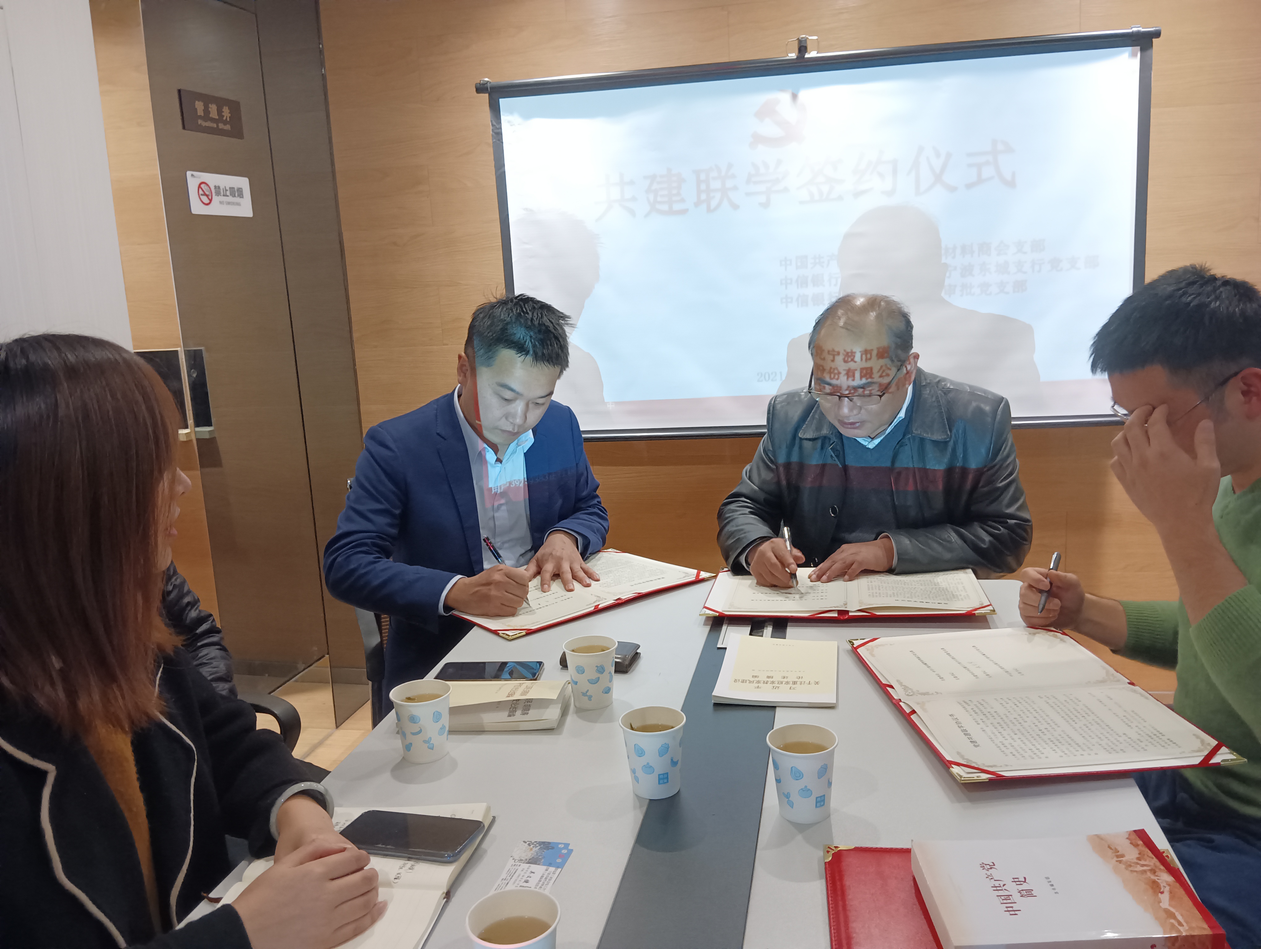 本次活动,中国共产党宁波市磁性材料商会支部书记周建斌与中信银行股份有限公司宁波东城支行党支部书记冯结和、中信银行宁波分行授信审批党支部书记张吉军进行党建共建联学签约仪式。在签署的党建共建联学协议书中,主要强调了要充分利用本单位的党建资源,分享交流党建工作经验,丰富各方党组织党建工作方式,提升党建工作水平。