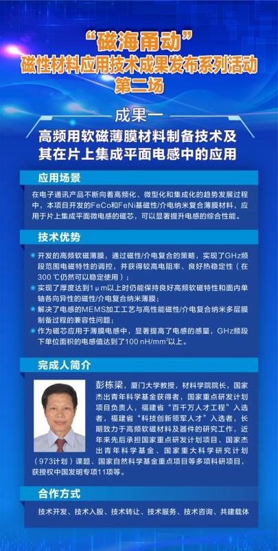 厦门大学材料学院彭栋梁院长首先给大家分享了高频用软磁薄膜材料制备技术及其在片上集成平面电感中的应用,随着电子通讯产品不断向着高频化、微型化和集成化发展,彭老师项目团队开发的FeCo和FeNi基磁性/介电纳米复合薄膜材料可应用于片上集成平面微电感的磁芯,具有较高电阻率、良好热稳定性、高频特性及MEMS可加工性,可显著提升电感的综合性能。