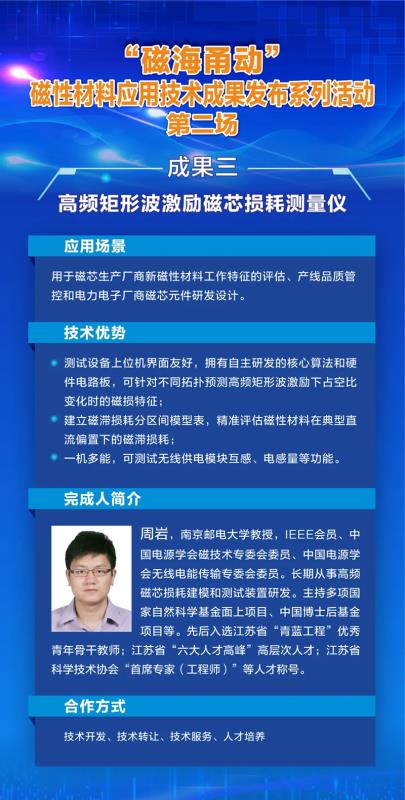 南京邮电大学周岩教授对高频矩形波激励磁芯损耗测量仪进行了介绍,该设备拥有自主研发的核心算法和硬件电路板,可针对不同拓扑预测高频矩形激励下占空比变化的磁损特征,并能自动分离磁滞损耗和涡流损耗。该设备可用于磁芯生产厂商新磁材料工作特征的评估、产线品质管控和电力电子厂商磁芯元件研发设计。周老师表示可以通过定制研发低成本测量设备,为企业提供专业分析服务、知识培训服务等角度开展合作。