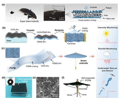 近期,中国科学院宁波材料技术与工程研究所陈涛研究员、肖鹏副研究员基于在碳基/高分子复合薄膜的构筑及其柔性传感器方面的研究基础(Chem. Mater., 2016, 28, 7125; ACS Nano, 2019, 13, 4368; Nano Energy, 2019, 59, 422; Nature Commun., 2020, 11, 4359; Nano Energy, 2021, 81, 105617; Adv. Funct. Mater., 2021, 31, 2105323),受到超疏水和自支撑性的超黑蝴蝶翅膀的启发,开发了一种弹性、超疏水、自支撑和导电的柔性传感器,可实现多功能的天气监测及水下传感与救援。