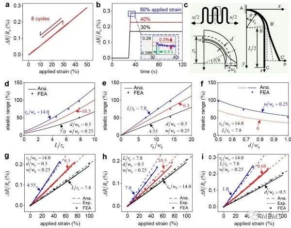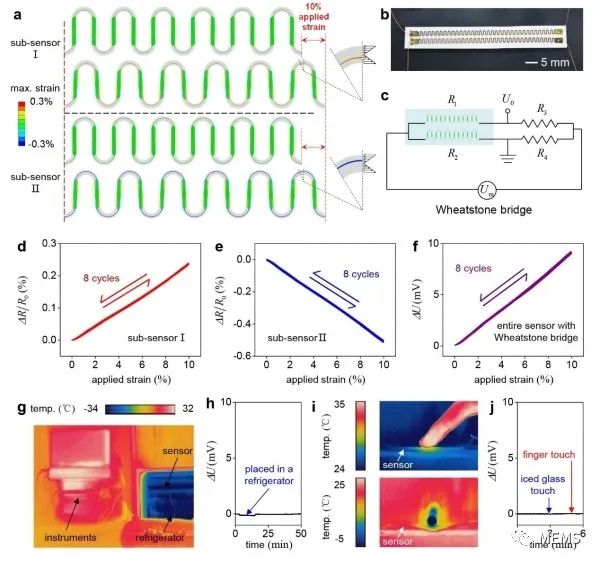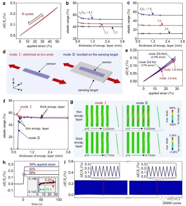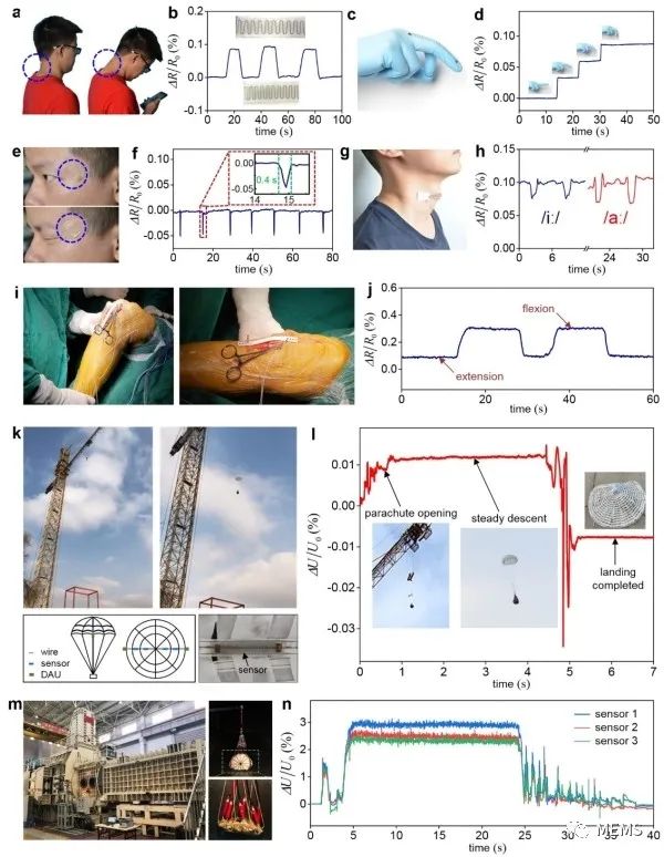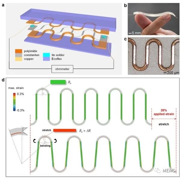 据麦姆斯咨询报道,近日,中国科学院力学研究所研究员苏业旺团队设计并制备出无接触电阻式柔性大应变传感器(图1),包含一个偏轴蛇形叠层结构(蛇形聚酰亚胺基底与覆盖层、偏离中心轴的蛇形康铜箔)和两层弹性封装层,其通过偏轴蛇形叠层结构中的拉伸-弯曲-拉伸变换机制实现0-50%的应变传感范围。理论分析、有限元模拟与实验测试(图2、图3)的结果综合表明,当传感器的圆弧段半径较大、聚酰亚胺基底宽度较窄、直线段较长和封装层较厚时,可以获得较大且稳定的弹性传感范围。在传感过程中,由于敏感材料康铜部分既不产生不稳定的接触电阻,也不涉及非线性本构和几何关系,该传感器保证了高重复性(重复性误差=1.58%)和高线性度(拟合优度>0.999)。进一步地,研究利用特殊设计的偏轴蛇形叠层结构和惠斯通电桥电路实现了温度自补偿功能(图4),最终传感器的输出电压温度系数可小至5×10⁻⁷°C⁻¹。如图5所示,该传感器可以应用于监测颈部、手指和眼部等的人体实时运动,如眨眼、发声和呼吸等;测量外科手术中组织变形,如全膝关节置换手术;监控柔性航天航空设备的应变状态,如降落伞和高空气球等。