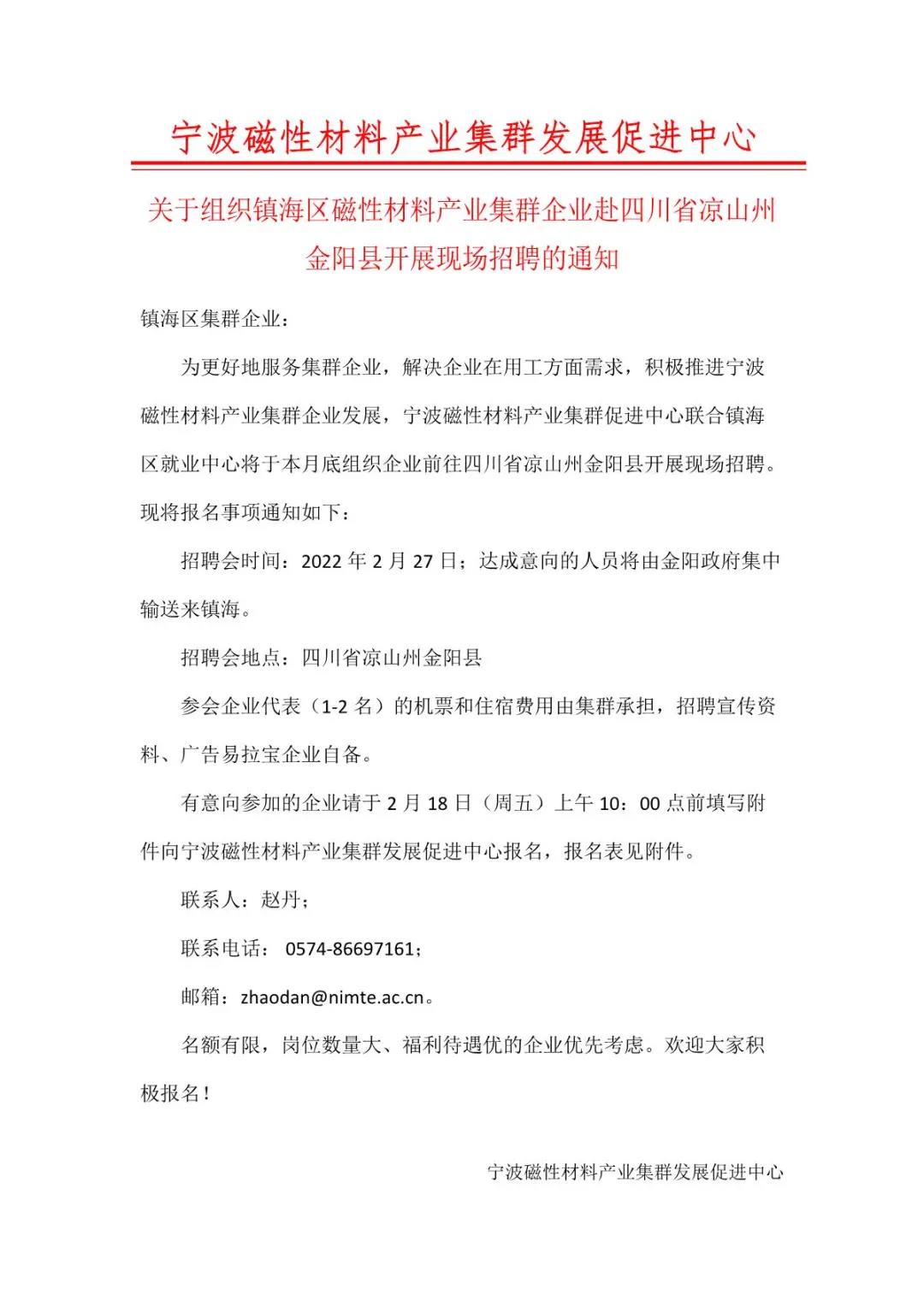 宁波磁性材料产业集群发展促进中心将于2月25日-28日组织镇海区内集群企业赴镇海区对口帮扶地四川省凉山州金阳县开展现场招聘。