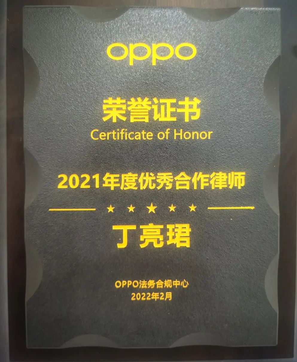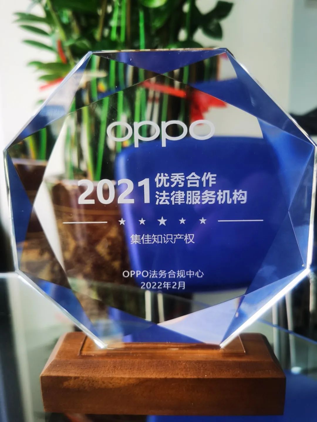 近日,集佳优质服务再次喜获客户点赞——OPPO授予集佳“2021优秀合作法律服务机构”,集佳律师丁亮珺也获评为“2021年度优秀合作律师”。