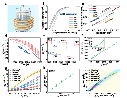 近期,该团队研究生蔡亮等人,在王军强研究员和霍军涛研究员的指导下,在磁场辅助增强电催化析氢性能方面取得了重要进展。该项工作系统研究了外加交变磁场(AMF)对Fe-Co-Ni-P-B磁性催化剂析氢反应(HER)的影响规律及其微观机制。研究发现AMF可以显著提高磁性催化剂的HER催化效率,在20mT的外加磁场下,其电流密度增加了27%。研究结果表明,磁场增强HER催化性能主要归因于洛伦兹力提高了电荷转移效率,而磁热效应的贡献较小。另外,Fe-Co-Ni-P-B电极的高磁导率和电磁涡流的趋肤效应可以进一步放大洛伦兹效应。该工作阐明了AMF增强磁性催化剂HER活性的新机制,为进一步改善磁性催化材料的性能提供了新思路。相关成果以“Key Role of Lorentz Excitation in the Electromagnetic-Enhanced Hydrogen Evolution Reaction”为题发表在国际知名期刊ACS Appl. Mater. Interfaces 2022 (14) 15243上。