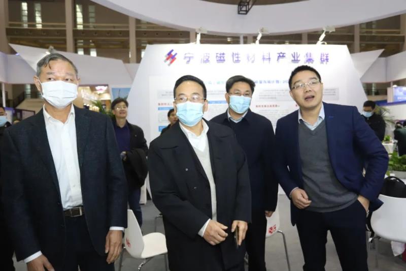 市政府副秘书长胡望荣、宁波市贸促会会长徐光宪等在浙江省磁性材料应用技术制造业创新中心总经理满其奎的陪同下,共同参观了“宁波磁性材料产业集群”展区。宁波磁性材料产业集群发展促进中心是在宁波市政府领导下,依托中科院宁波材料所成立,并在工信部组织的2020年先进制造业集群竞赛中优势胜出。促进中心面向宁波及国家磁性材料产业重大需求为目标,通过沟通交流、协同管理、监督激励和对外合作等方式,促进磁性材料产业高质量发展。