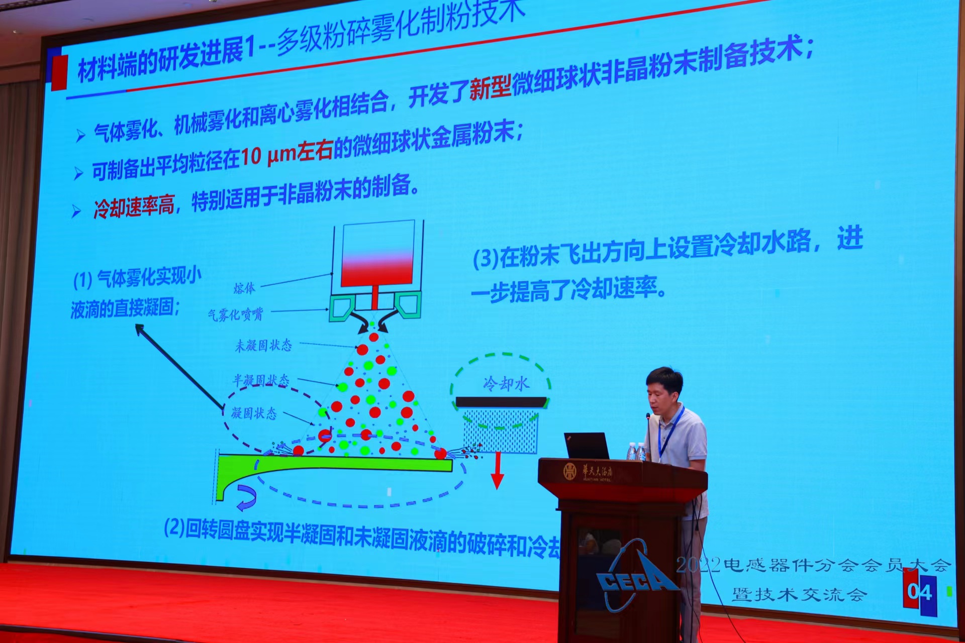 期间,分会领导总结了上年度工作并分析预测了新年度的行业发展,来自企业、高校的8位专家分享了汽车电子及关键材料的应用和发展趋势以及电感器产品生产、材料、检测等相关技术。其中,中科院宁波材料所、浙江省磁性材料应用技术创新中心非晶项目组贾行杰博士在大会上分享《一体成型电感用非晶纳米晶软磁复合材料的制备与性能调控研究》,从非晶纳米晶的研发背景、生产工艺、性能参数以及微型模压电感的实际应用开发等方面介绍了团队的项目成果。该项目生产的非晶软磁粉末具有球形度高、粉末粒径小、饱和磁感应强度高、损耗低等优异性能,已经实现了批量生产和部分进口替代。报告得到了参会代表们的高度关注和积极评价。