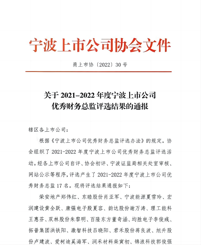 日前,宁波上市公司协会根据《宁波上市公司优秀财务总监评选办法》的规定,组织了2021-2022年度宁波上市公司优秀财务总监评选活动,并于2022年11月8日发布了《关于2021-2022年度宁波上市公司优秀财务总监评选结果的通报》,公司董事会秘书、副总经理兼财务总监肖亚军被评为“2021-2022年度宁波上市公司优秀财务总监”。