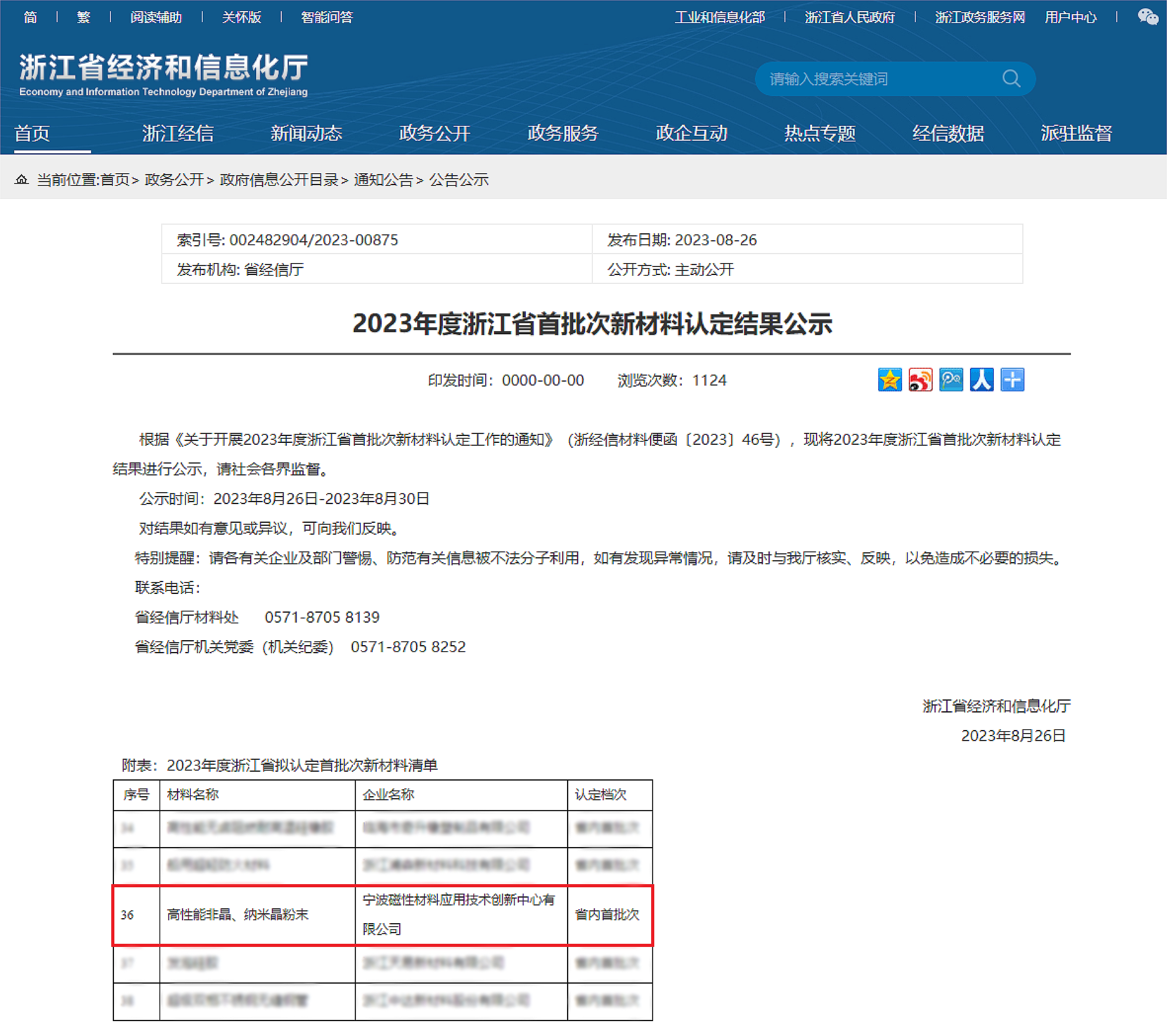 2023年8月26日,浙江省经济和信息化厅对2023年度浙江省首批次新材料认定结果进行公示。宁波磁性材料应用技术创新中心有限公司的“高性能非晶、纳米晶粉末”成功入选省内首批次。