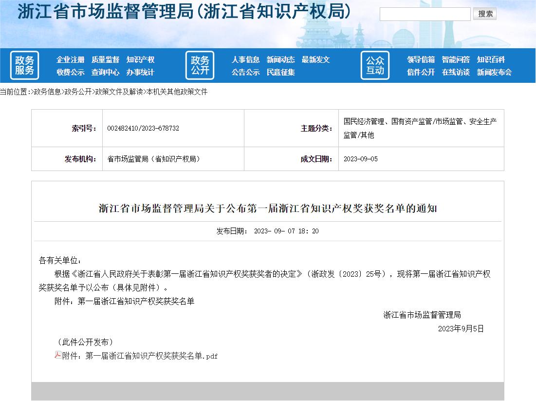 浙江省知识产权奖是浙江省首次以省政府名义设立的全门类知识产权综合奖,也是全国唯一涵盖知识产权全门类、“创运保管服”全链条的知识产权领域省级政府奖,旨在表彰激励在知识产权领域取得重大改革创新突破,产生重大示范引领效应,或知识产权全链条保护取得重大成效,在经济、社会、生态等方面作出重大贡献的单位或个人。