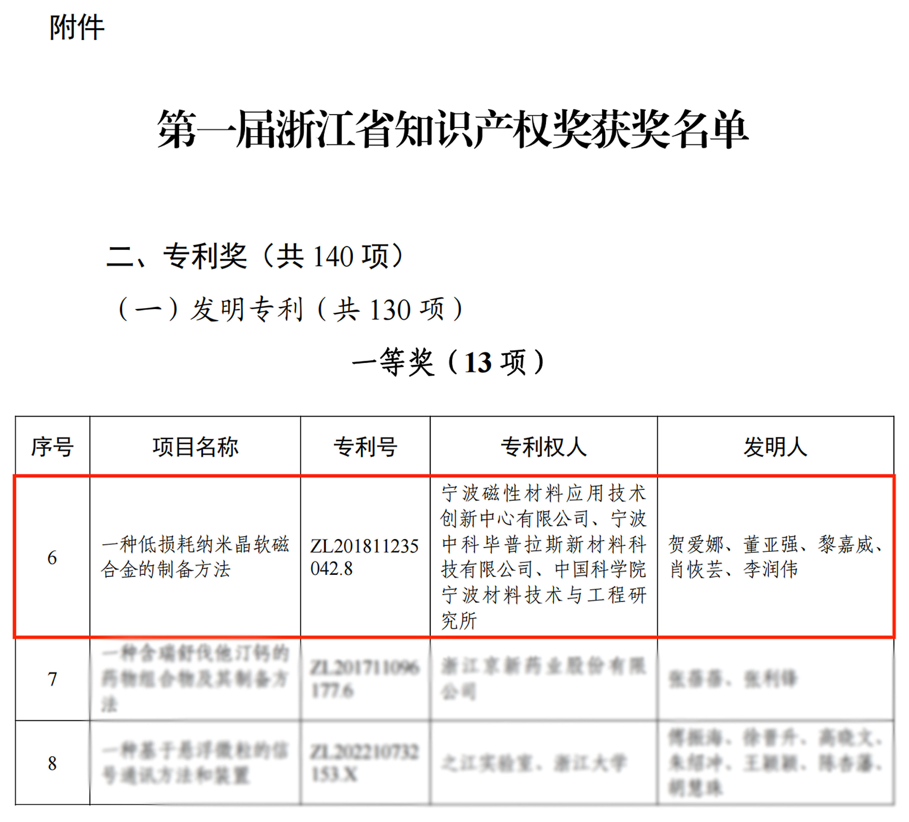 近日,浙江省市场监督管理局公布了第一届浙江省知识产权奖获奖名单。宁波磁性材料应用技术创新中心有限公司、宁波中科毕普拉斯新材料科技有限公司、中国科学院宁波材料技术与工程研究所申报的“一种低损耗纳米晶软磁合金的制备方法”的专利(专利号:“ZL201811235042.8”)经过严格审查,在本届浙江省知识产权奖评选中荣获一等奖。