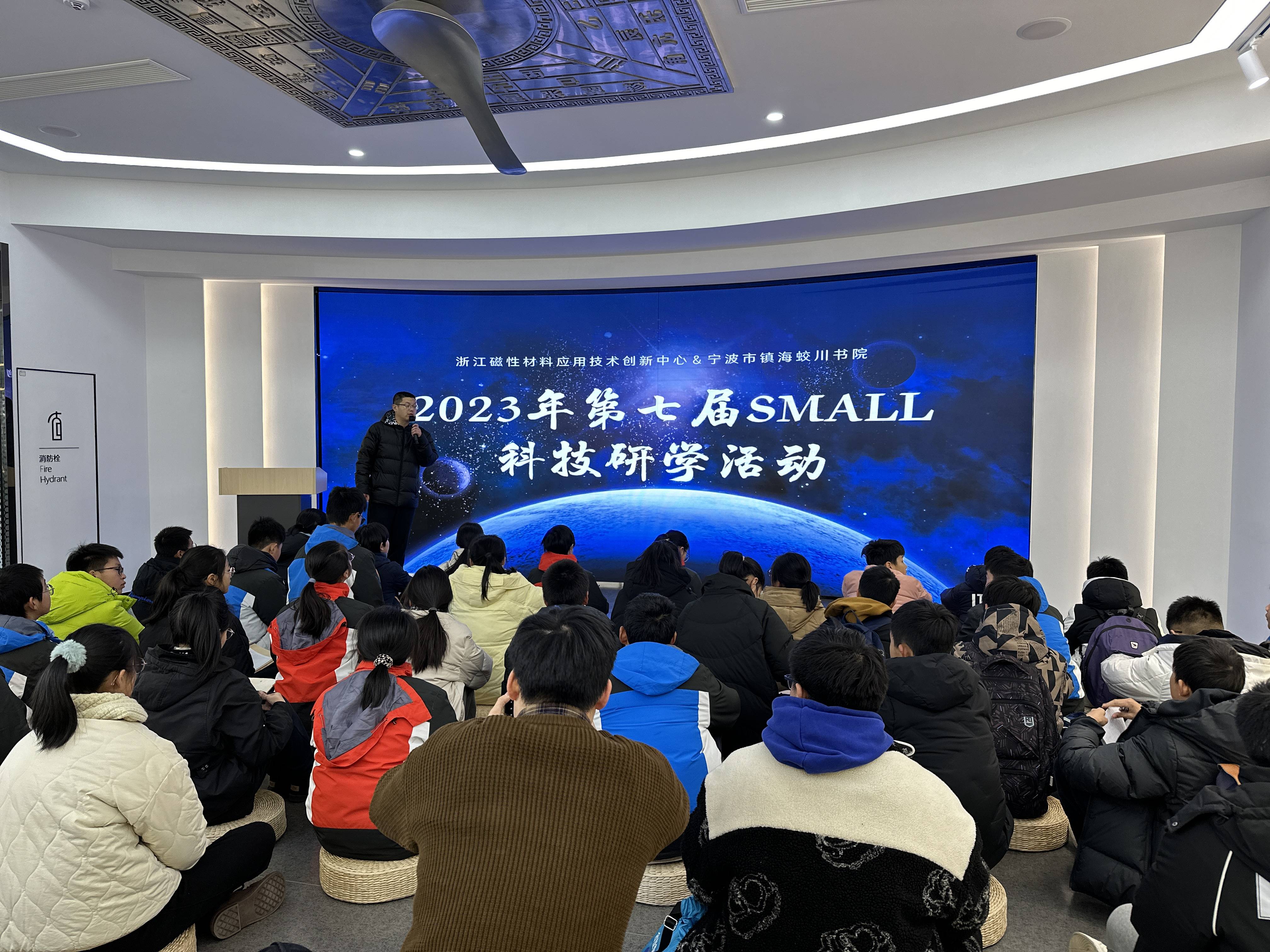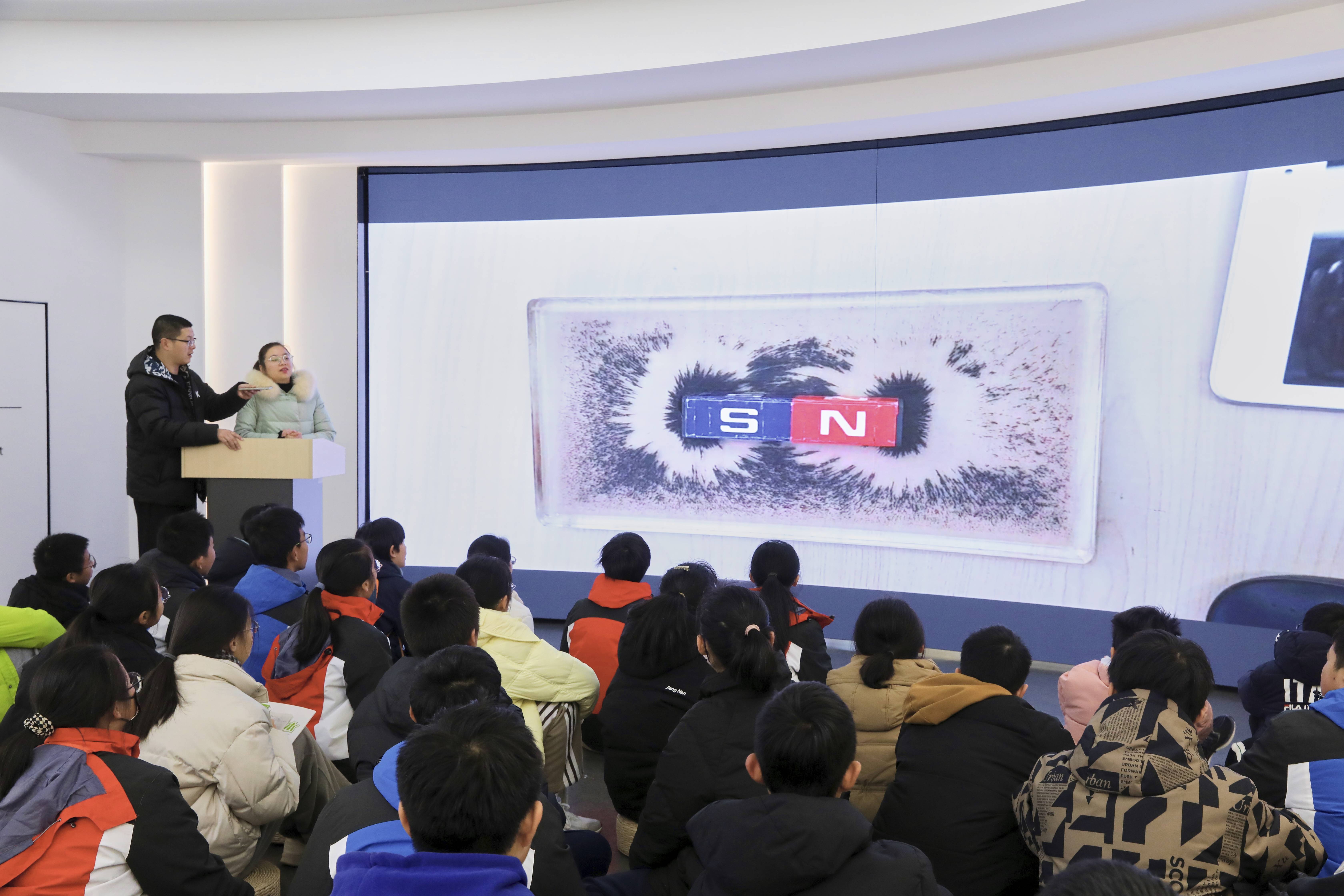 在创新中心的曲面展示屏前,学生们席地而坐,认真聆听由蛟川书院朱老师带来的现场磁学讲座。内容涉及磁学的发展史、磁学的原理演示以及磁学的重大应用。学生们身临其境,在老师的娓娓叙述中重温磁学发展脉络、感知磁学原理、激发应用灵感。他们的思绪越古达今,穿梭于浩瀚星空,在灵光闪现的脑海里寻找宇宙带给人类的最原始、最悠久、最神奇、最节能环保的材料。