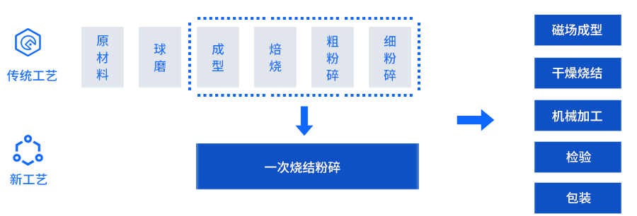 相比于传统工艺,新工艺能耗降低,经济和环境效益突出; 非掺杂的SrFe12O19,剩磁可达到4100Gs,矫顽力可达到4100Oe; 掺杂La-Co的SrFe12O19,剩磁可达到4500Gs,矫顽力可达到4500Oe。