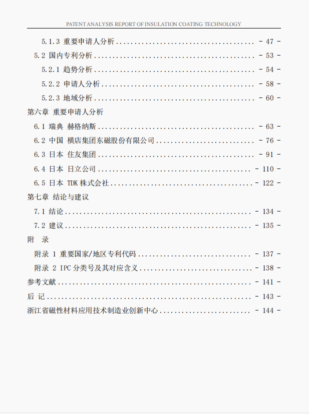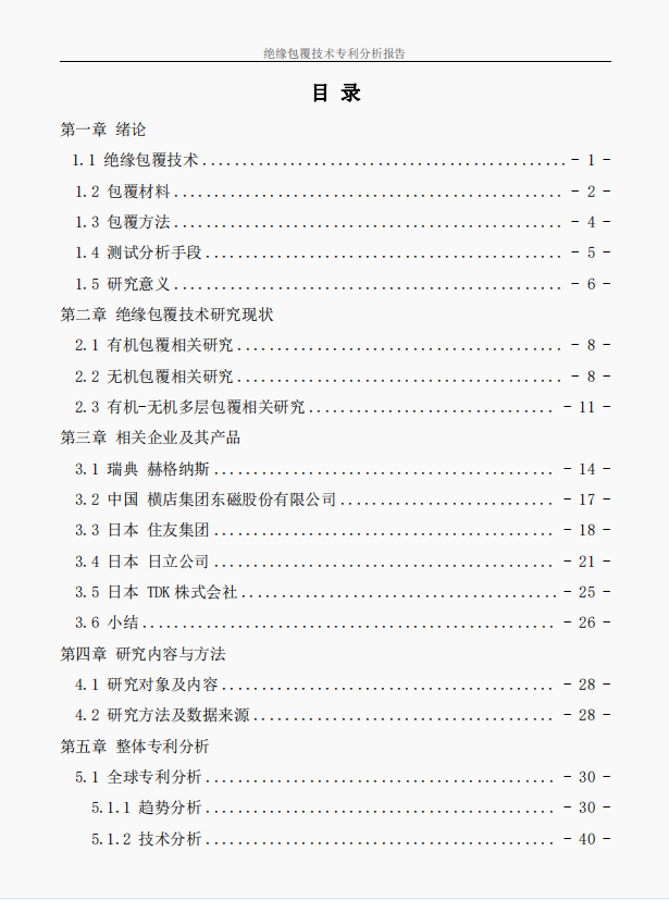 本报告主要以绝缘处理技术为研究对象,从专利和文献为切入点,从全球角度和中国角度宏观分析绝缘包覆技术的研究现状和发展趋势,选取重点申请人进行详细的专利分析,意在帮助行业更好的了解全球绝缘包覆技术,可作为行业内相关专利和技术布局参考。