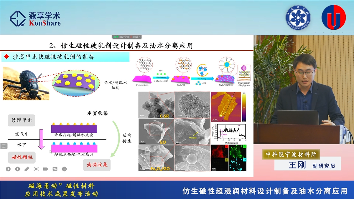 曾志翔研究员和王刚副研究员分享了题为“仿生磁性超浸润材料设计制备及油水分离应用”的报告。其团队提出了一种基于摩擦化学的固-固修饰方法制备超浸润性表面,具有绿色、普适、制备方法简易的特点,研发的仿生超浸润的磁性吸附分离材料具有优异的油水选择性及磁控回收性,可实现水面浮油、水下重油、水包油乳液等油水混合物的高效分离,在海洋溢油清除与回收、工业含油废水处理、油田乳化油破乳等方面具有广泛的应用价值与前景。