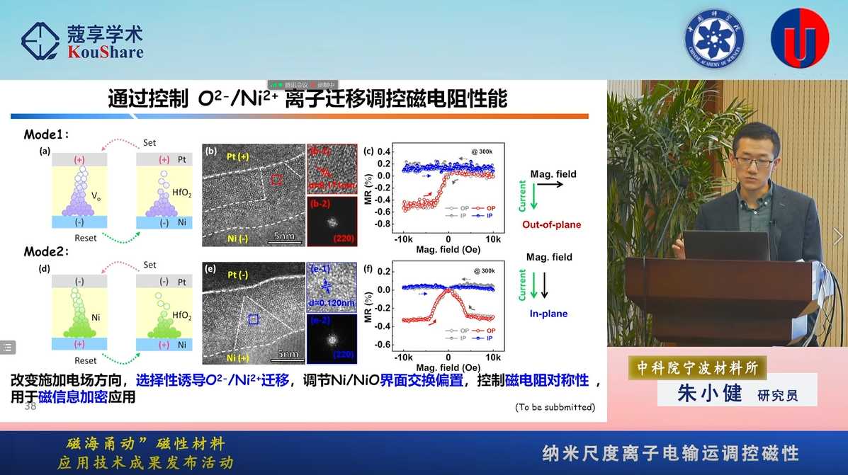李润伟研究员和朱小健研究员分享了题为“纳米尺度电场驱动离子输运调控磁性”的报告。其团队发展了利用电场控制固态电介质中纳米离子的输运以调控纳米磁性的研究技术,展示了该技术在室温下对磁性金属和磁性半导体材料的磁化强度、磁化方向和磁交换偏置等特性的高效调控,为实现低功耗、高密度的磁信息存储等提供了一种全新技术方法。