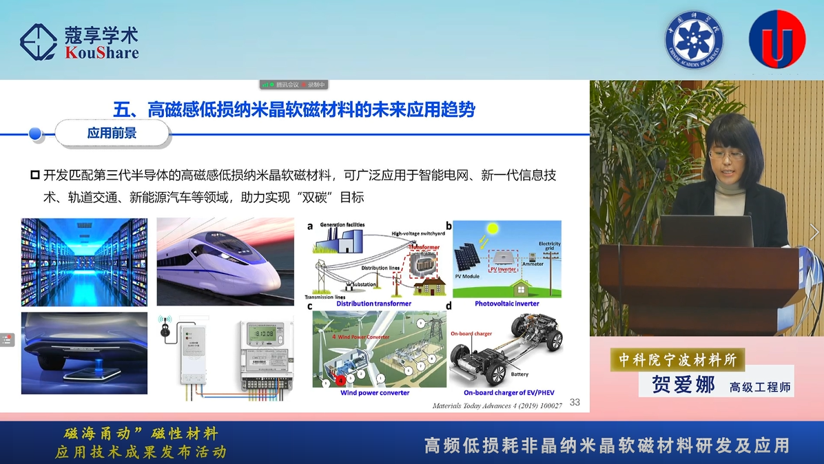 董亚强高级工程师和贺爱娜高级工程师分享了题为“高磁感低损耗高磁感低损纳米晶软磁材料的研发及应用探讨”的报告。其团队研发的磁感各向异性调控技术与适于产业化宽幅生产的高磁感低损纳米晶软磁材料,具有磁导率高、损耗低、频率稳定性好等特性,可应用于智能电网、新一代信息技术、无线充电、智能制造、白色家电、航空航天、轨道交通和新能源汽车等领域具有广泛的应用价值与前景。
