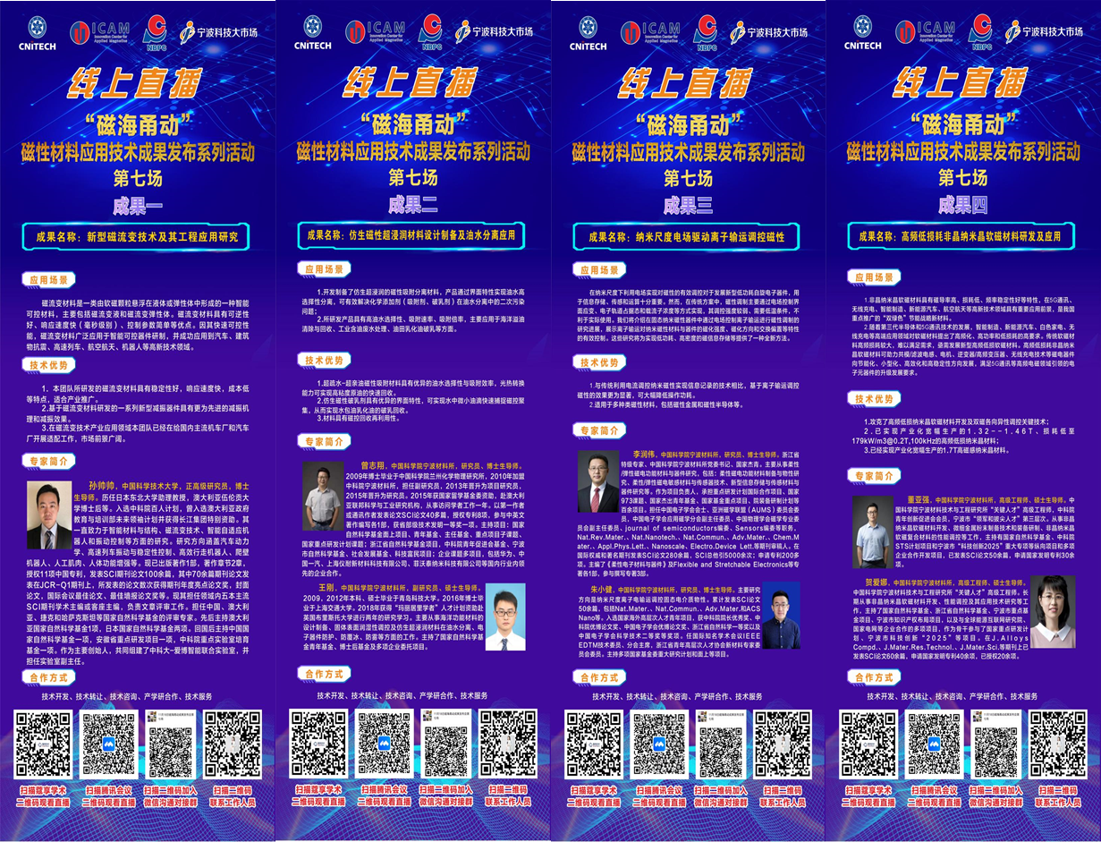 为促进磁性材料应用技术成果的转移转化,强化创新链、产业链、服务链、政策链、资金链的深度融合,助推宁波市科技创新和产业集群高质量发展,由中国科学院宁波材料技术与工程研究所、宁波磁性材料产业集群发展促进中心(工信部)、浙江省磁性材料应用技术制造业创新中心、浙江省磁性材料产业创新服务综合体等单位联合主办的“磁海甬动”磁性材料应用技术成果发布系列线上直播活动第七场于11月18日成功举办。