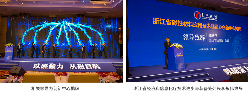 宁波市陈炳荣副市长、中科院物理所沈保根院士、南京大学都有为院士、浙江省经信厅李永伟处长、宁波市经信局张世方局长、宁波市科技局黄志明局长、镇海区人民政府黄向华副区长、中国科学院宁波材料技术与工程研究所黄政仁所长等领导和专家出席了活动并共同为创新中心揭牌。拉开了专注于磁性材料上下游产业这个特定领域的,先进制造技术成果转化与应用推广的“创新中心”建设的序幕。