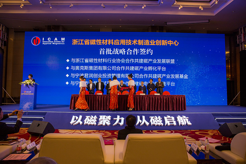 活动过程中,浙江省磁性材料应用技术制造业创新中心与浙江奥克斯创业服务有限公司、浙江省磁性材料协会、宁波市计量测试研究院、宁波君润创业投资管理有限公司签署了战略合作协议。合作单位将在磁性材料检测平台与标准研制方面、磁性材料及其相关产业的技术成果转移转化、项目立项、项目孵化及项目评估等方面、以及产业基金建设方面展开深层次、全方位的合作,将浙江省磁性材料应用技术制造业创新中心打造成磁性材料领域国内权威、国际领先的应用技术链创新生态系统。